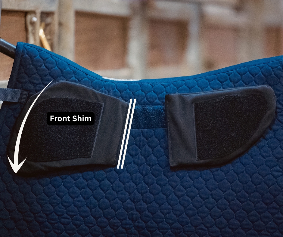 Front shims help you achieve extra lift or clearance where needed, but they must be placed appropriately. They are used to provide extra support at the front of the saddle to give lift over a prominent wither or where muscle is lacking. They can also be used to help balance the rider by raising the front of the saddle and placing weight back over the seat bones.