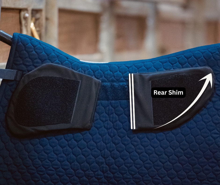 Rear shims sit under the back of the saddle panel, following the same shape as the base. They are used to provide support at the rear of the saddle to either give lift, providing support under the rider’s seatbones, or support where muscle is lacking. They can also be used for rider balance if the horse has a dipped or asymmetrical back.